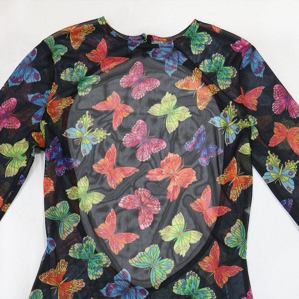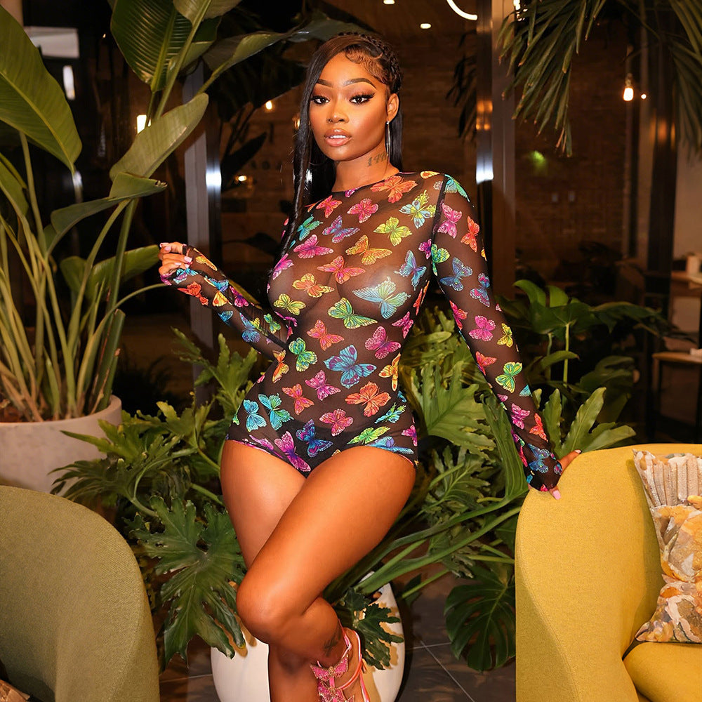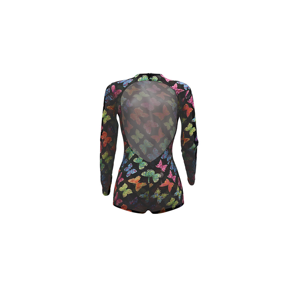 Sexy Backless Transparent Butterfly Print Long Sleeve Jumpsuit Women's Shorts